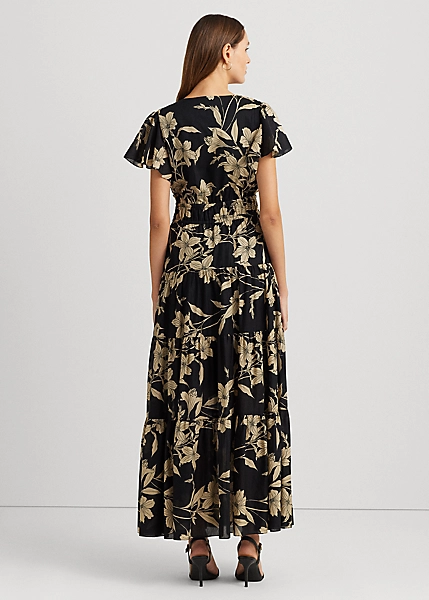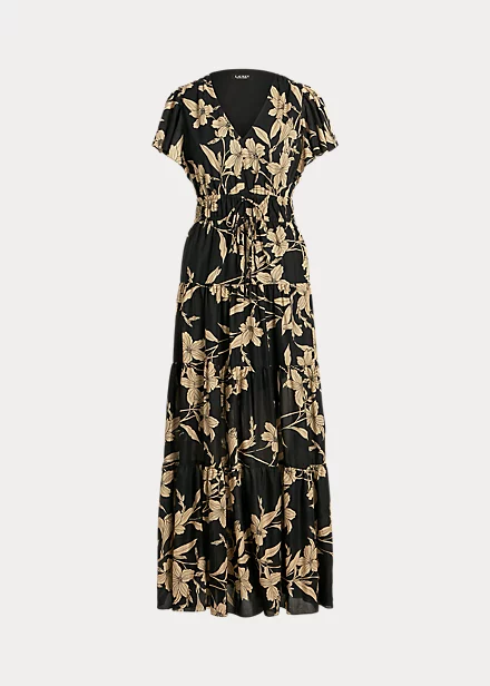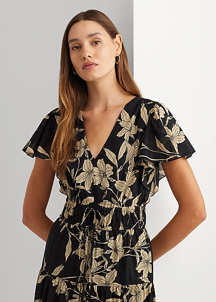 Un voile de coton aérien et une jupe gitane confèrent un mouvement naturel à cette maxi robe, tandis qu’une taille élastique assure un ajustement parfait. Le motif fleuri bicolore de la saison et des mancherons volantés fantaisie lui confèrent son allure romantique.