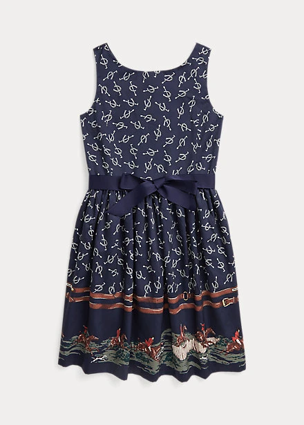 Cette robe arbore une silhouette patineuse, une ceinture en gros-grain et un motif évoquant la passion de Ralph Lauren pour le style équestre.