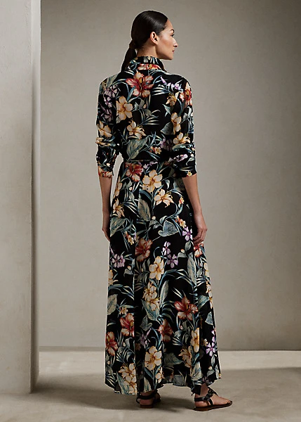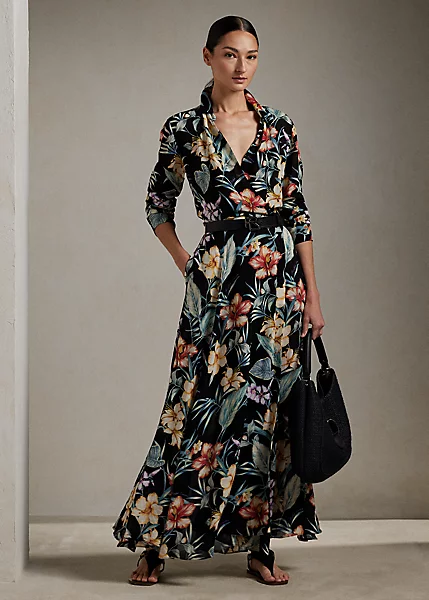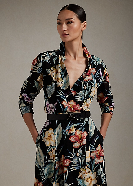 Un voile de lin léger et aérien imprimé de l’interprétation glamour signée Ralph Lauren d’un motif d’inspiration tropicale confère un drapé remarquable à la robe Aniyah, qui se caractérise par une silhouette portefeuille intemporelle. Sa patte asymétrique crée un col en V croisé plongeant, tandis qu’une ceinture à boucle souligne la taille.
