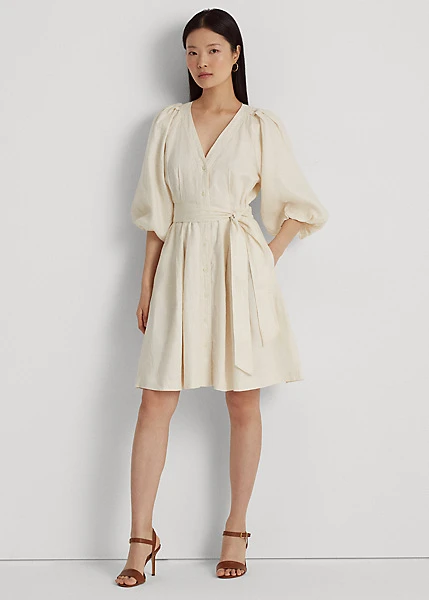 Cette robe patineuse se caractérise par des manches ballons volumineuses et une taille ceinturée. Confectionnée en lin léger pour un aspect et un toucher aériens, cette pièce est émaillée de boutons gravés de l’inscription « Lauren Ralph Lauren ».