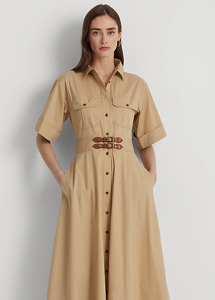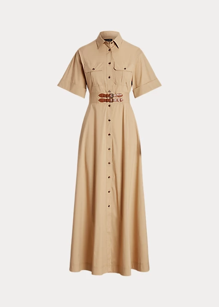 Inspirée des emblématiques chemises d’inspiration surplus signées Ralph Lauren, cette robe-chemise est rehaussée de boucles en cuir vegan, de boutons façon corne et de poches appliquées à rabat boutonné sur la poitrine. Doté d’une longueur maxi, ce modèle virevoltant en coton mélangé stretch léger est une pièce à la fois confortable et chic.
