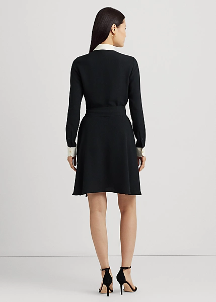 Lauren Ralph Lauren revisite la chemise classique sous forme de robe bicolore confectionnée dans une douce georgette double face pour un look soigné. Une ceinture assortie souligne la taille, tandis que des boutons gravés distinctifs complètent le look.