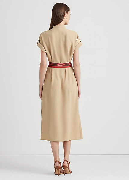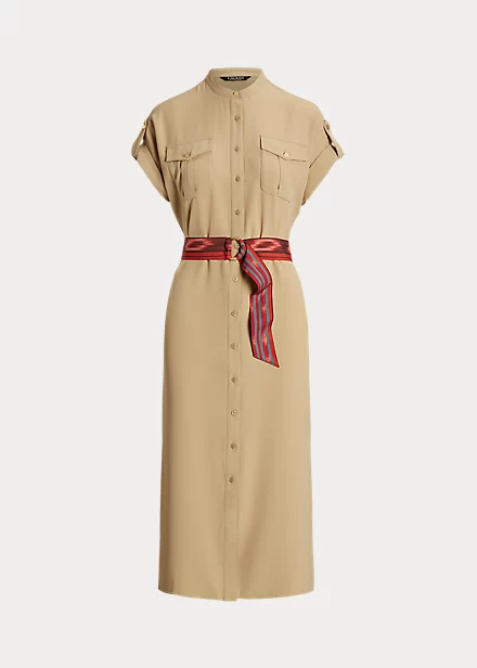 Les manches courtes à pattes d’enroulement et les poches d’inspiration surplus accentuent le charme décontracté de cette robe-chemise, confectionnée en georgette double face douce pour un look soigné. Elle est rehaussée d’une ceinture dotée d’un anneau en D gravé de l’inscription « LRL » et ornée de l’un des motifs de la saison inspiré des techniques de tissage ikat traditionnelles indiennes, qui se caractérisent par des motifs de plumes flamboyants et brumeux.