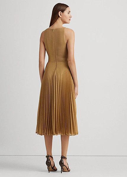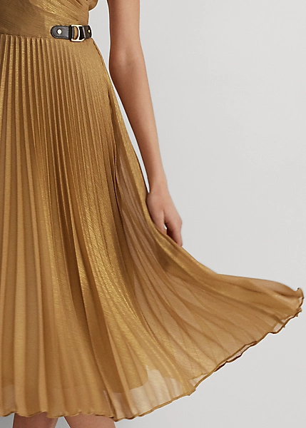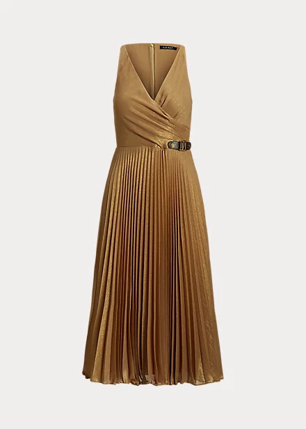 Un plissage soleil impeccable sur la jupe et une mousseline de soie métallisée scintillante caractérisent cette superbe robe de cocktail. Dotée d’un élégant col en V croisé, elle arbore une patte à boucle en cuir vegan gravée du monogramme « LRL » sur la taille pour une touche distinctive.