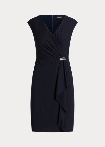 Confectionnée en jersey fluide, cette robe de cocktail arbore des mancherons volantés et des ruches délicates sur le corsage qui se rejoignent à la taille avec une broche ornée de strass scintillants. Des volants en cascade subliment la jupe pour une finition élégante.