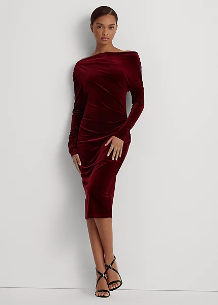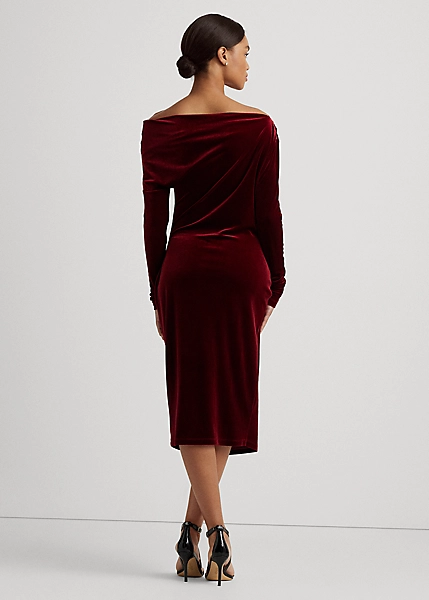 Confectionnée dans un somptueux velours stretch pour un toucher doux et un éclat subtil, cette robe de cocktail arbore une superbe encolure asymétrique. D’élégants plis lui confèrent un charme intemporel.