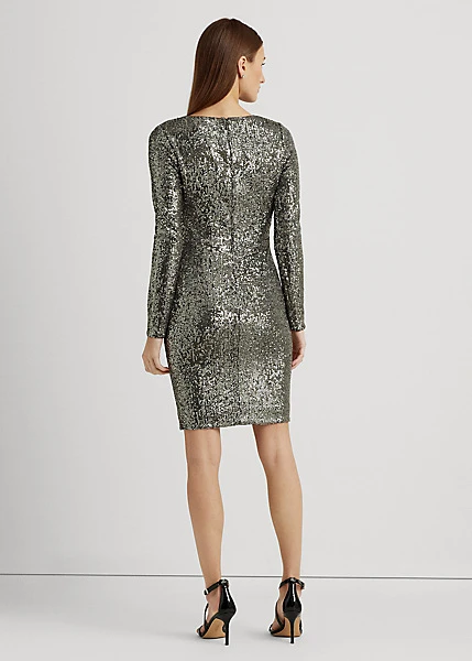 Faites sensation dans cette robe de cocktail près du corps rehaussée de sequins scintillants, ce qui lui confère un look audacieux. L’encolure croisée sur le devant dotée d’une ouverture goutte d’eau apporte une touche contemporaine.