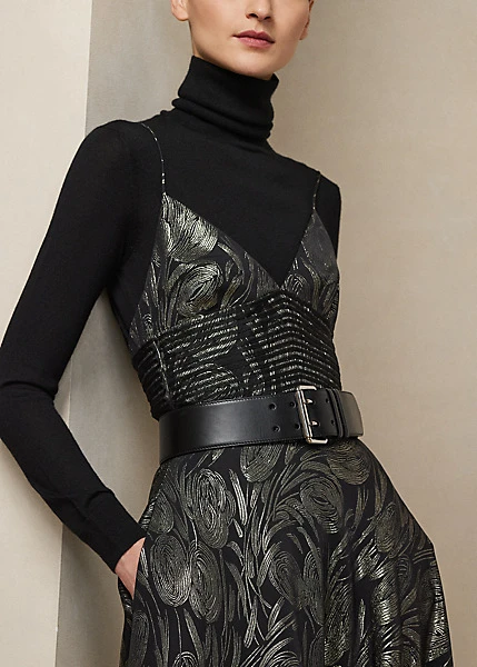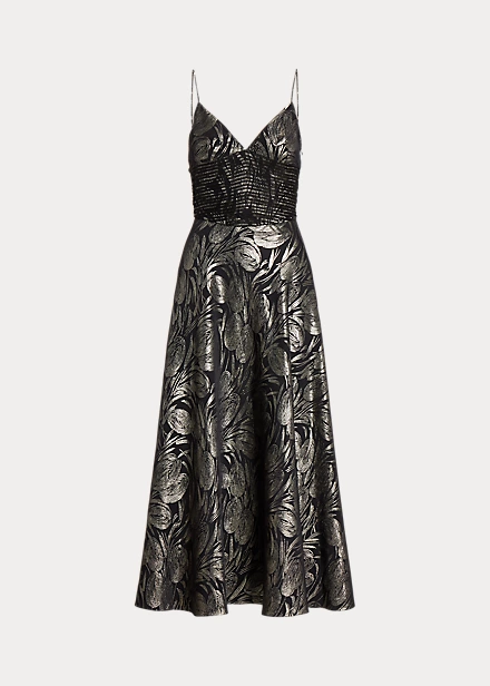ConfectionnĂ© en Italie par des maĂ®tres artisans, le modèle Henri confère une Ă©lĂ©gante allure aux tenues de soirĂ©e avec des Ă©lĂ©ments romantiques très apprĂ©ciĂ©s tels que de fines bretelles spaghetti, un col en V flatteur et des bandes de crinoline appliquĂ©es qui Ă©pousent magnifiquement le corsage. DotĂ©e d’une jupe ample jusqu’Ă la cheville pour une plus grande libertĂ© de mouvement, sa confection en jacquard charismatique se caractĂ©rise par un motif fleuri mĂ©tallisĂ© pour plus d’Ă©clat et de brillance.