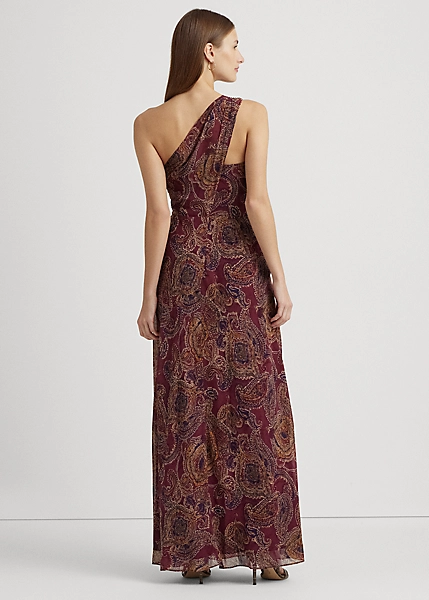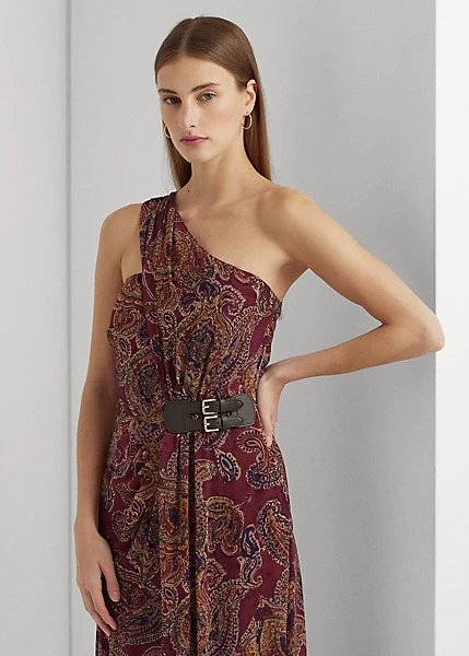 Reflétant le charme d’inspiration équestre du style Ralph Lauren, cette robe de soirée asymétrique est rehaussée d’une somptueuse patte à boucle en cuir vegan sur la taille. Elle est ornée du motif cachemire de la saison et confectionnée en georgette froissée pour obtenir un look aérien.