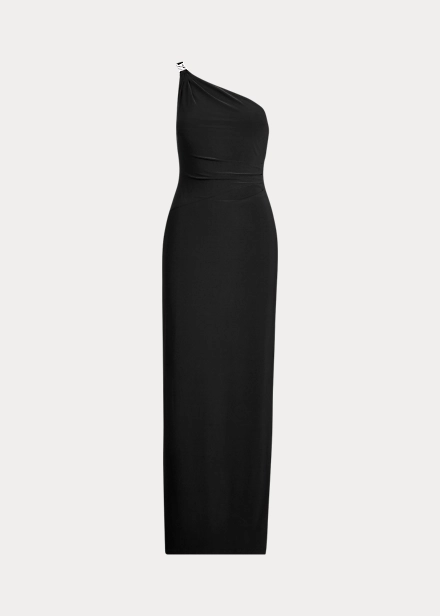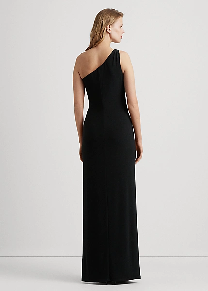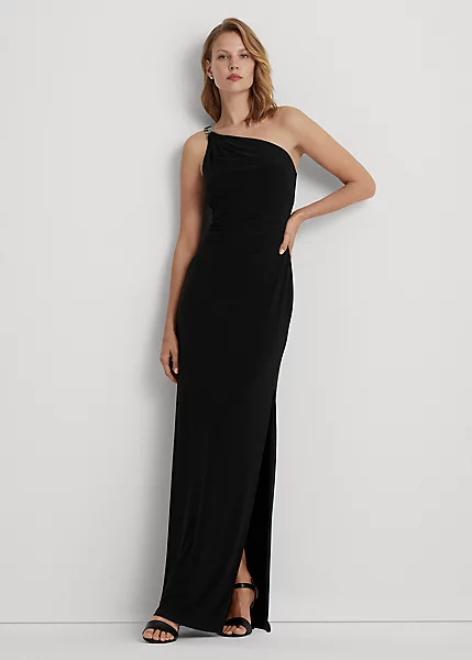 Cette robe en jersey près du corps se caractérise par une silhouette asymétrique. Des fronces délicates très féminines soulignent la taille tandis qu’une finition en maillon de chaîne ornée de strass sur la bretelle ajoute une touche de glamour.