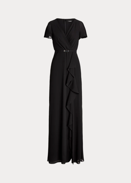 La georgette froissée légère et les volants fluides en cascade sur la jupe confèrent du mouvement et une allure luxueuse à cette robe longue sculpturale. Les mancherons volantés aériens apportent une touche délicate, tandis que la ceinture assortie ornée au centre d’une boucle gravée du monogramme « LRL » définit la silhouette.