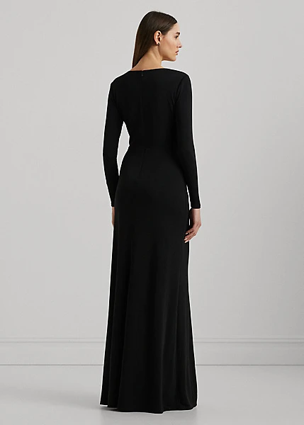 Confectionnée en jersey stretch pour un toucher doux et une aisance de mouvement, cette robe de soirée se caractérise par un élégant détail croisé à la taille. Doté d’une silhouette raffinée près du corps, ce modèle à manches longues s’impose comme un choix chic pour votre prochain événement.