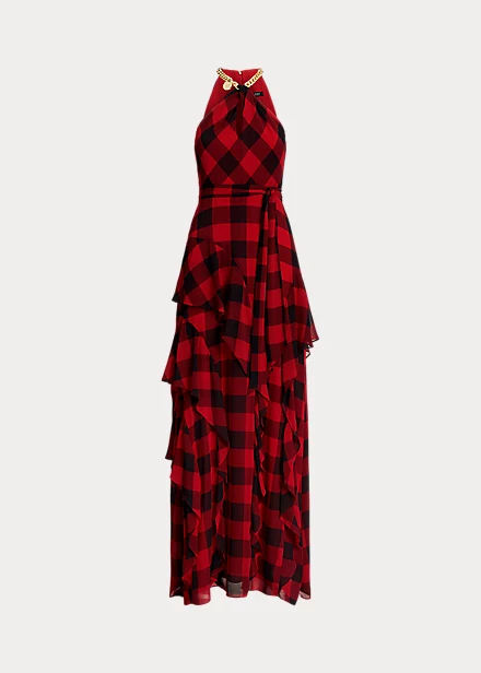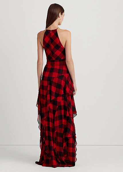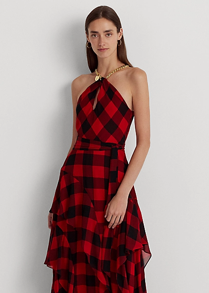 Rehaussée du motif à carreaux Buffalo de la saison, cette robe du soir dos nu est ornée d’une breloque cadenas gravée du monogramme « LRL » sur l’encolure pour une touche distinctive. Une ceinture assortie sur la taille sublime sa silhouette trapèze, tandis qu’une georgette froissée et une jupe gitane à bordure volantée créent un mouvement naturel à chaque pas.