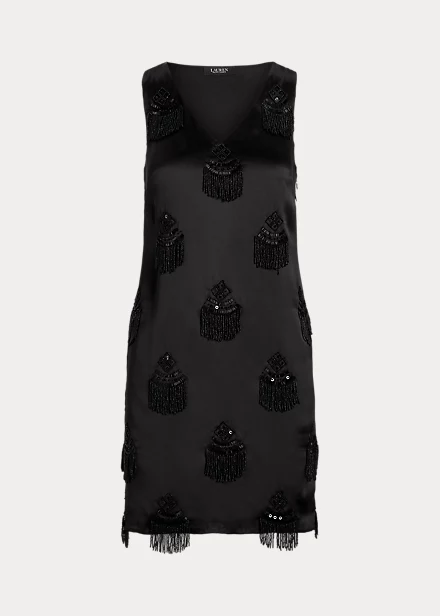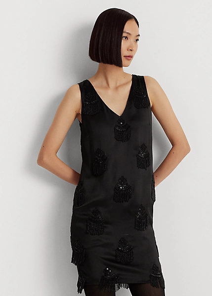 De scintillantes pampilles perlées ornent la silhouette droite de cette robe de cocktail sans manches pour un style glamour inspiré des années 20. Un satin doux lui confère une finition brillante.