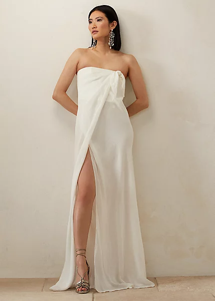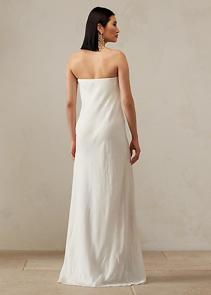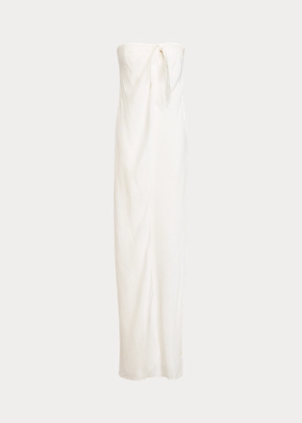 Inspirée d’une photo vintage de Ricky, la femme et muse de M. Lauren, prise lors d’un voyage en famille en Jamaïque, cette robe bustier Brigitta évoque le look décontracté d’un sarong avec une silhouette portefeuille dont les plis se rejoignent gracieusement sur le col, puis s’ouvrent sur la jupe pour une plus grande liberté de mouvement. Sa confection en voile de lin sublime son toucher aérien et léger.