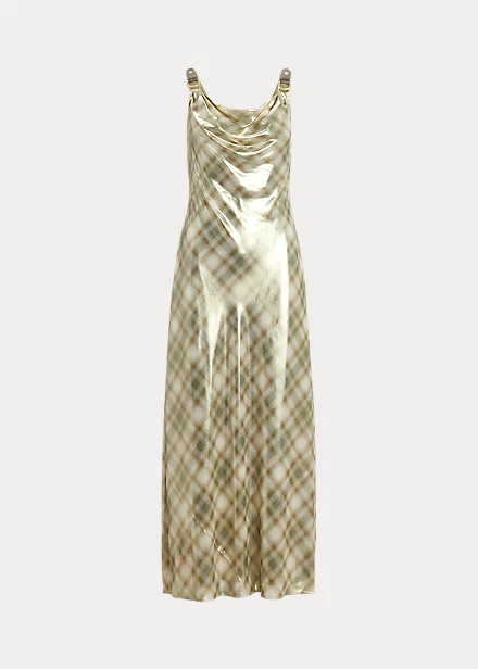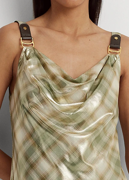 Confectionnée en georgette fluide rehaussée d’un éclat métallisé, cette robe de soirée à col boule est ornée de superbes pattes à boucles en cuir vegan au niveau des bretelles. Cette pièce affiche le motif écossais ombré de la saison pour allier style sophistiqué et silhouette contemporaine.