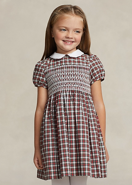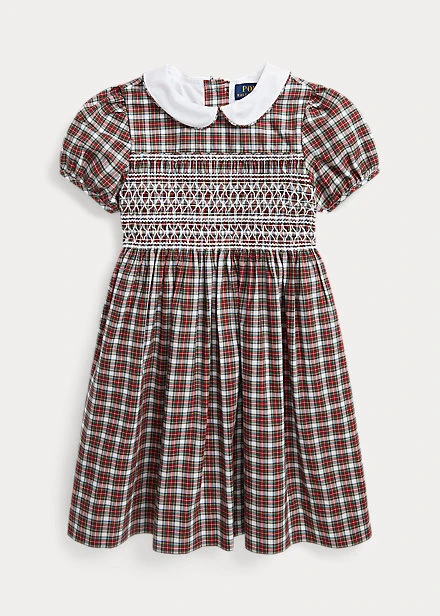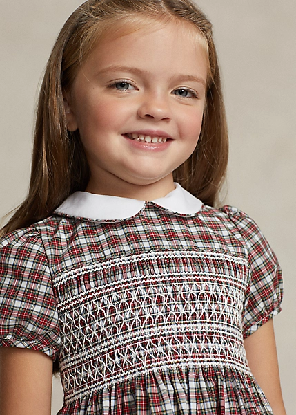 Cette robe en coton idéale pour les grandes occasions arbore le motif écossais de la saison, des smocks délicats et une bordure passepoilée.