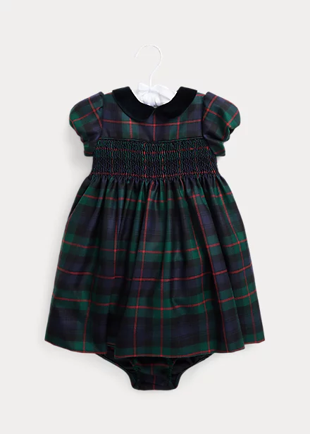 Issue de notre collection Ralph Lauren Bébé exclusive, cette robe festive en laine arbore un col Claudine en velours, le motif écossais de la saison et des smocks délicatement fumés à la main sur l’empiècement. Il est livré avec un cintre en satin rembourré, faisant de cette pièce un cadeau idéal.