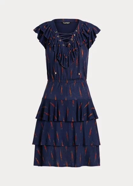 Dotée d’une bordure volantée, d’une jupe gitane et d’un laçage sur l’encolure, cette robe incarne naturellement le charme romantique. Confectionnée en jersey de lin mélangé léger pour plus de douceur, elle arbore l’un des motifs de la saison inspirés de techniques ancestrales de tissage.