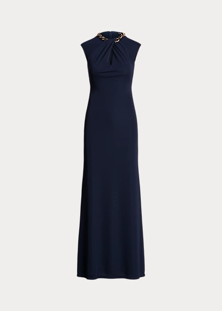 Une chaîne dorée à motif écaille orne l’encolure de cette robe du soir près du corps à mancherons confectionnée en jersey stretch doux pour une grande liberté de mouvement. Ce modèle est rehaussé d’une ouverture goutte d’eau au milieu de l’encolure pour une touche contemporaine.