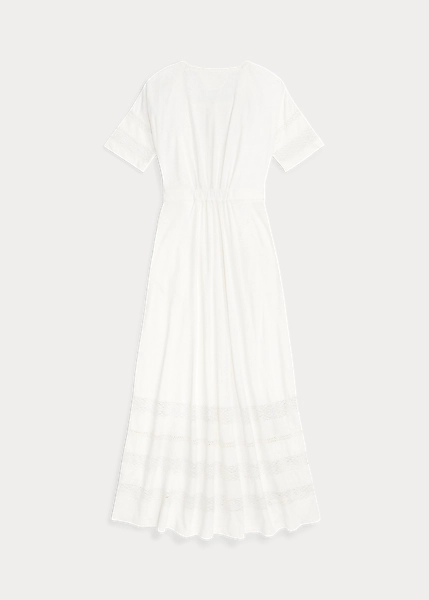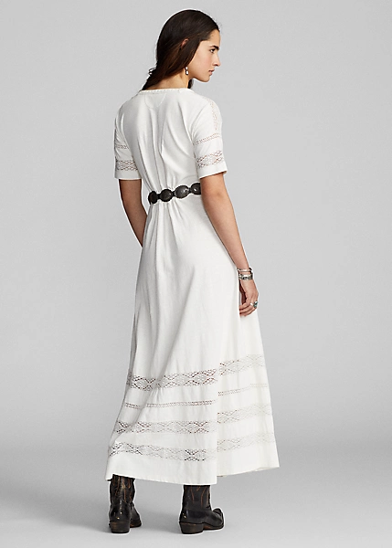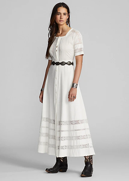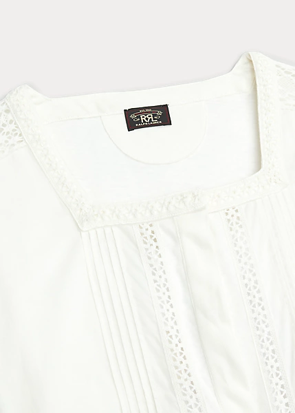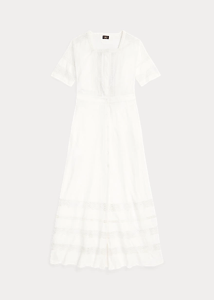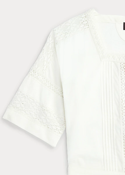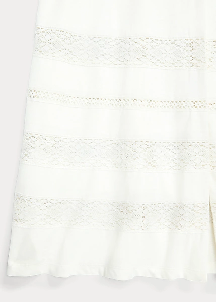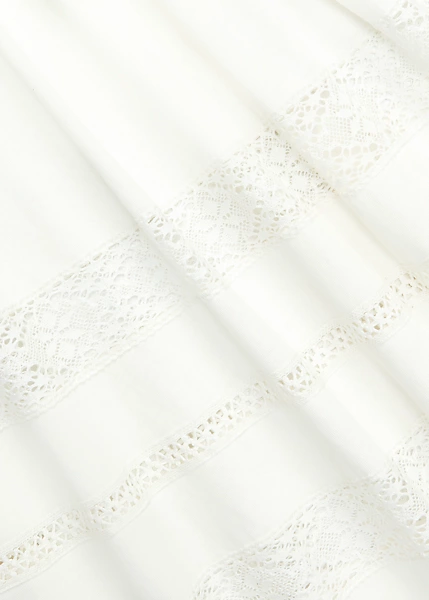 Modèle confectionné dans un jersey léger de lin et de coton. Insert avec dentelle sur l’ensemble. Bordure en voile de coton sur la patte et plis piqués sur le haut devant. Taille élastique à l’arrière. Jupe doublée de voile de coton. Boutons en nacre.