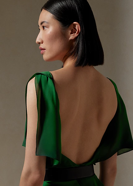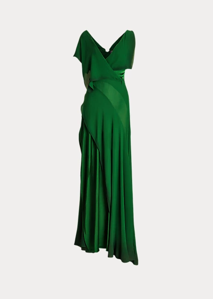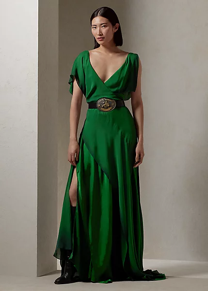 Version romantique des tenues de soirée, le modèle Johnathon est savamment conçu avec des volants élégamment drapés sur le corsage pour une structure effet portefeuille et des manches fluides. Dotée de volants asymétriques en biais sur la jupe, sa longue silhouette trapèze est confectionnée dans des tissus alternés pour une juxtaposition unique de mat et de brillance. Une double georgette de soie italienne sculpte le corps et confère une touche de délicatesse à cette tenue de soirée, tandis que la jupe est dotée d’un empiècement en satin stretch pour un toucher doux. Témoignant de l’attachement de M. Lauren aux détails raffinés, un technicien hautement qualifié a utilisé une technique d’aérographe sur les bords du tissu pour un look d’inspiration vintage.