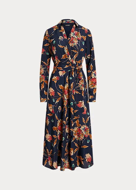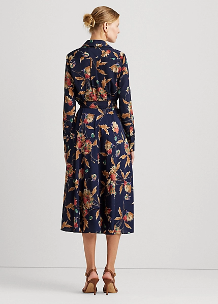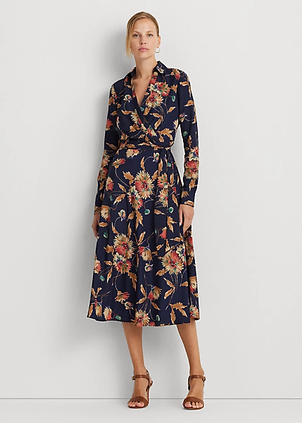 Le haut à effet cache-cœur et la taille ceinturée accentuent l’élégance décontractée de cette robe mi-longue, tandis que le col à pointes et les poignets à boutons ajoutent une touche sophistiquée. Orné du motif fleuri pictural de la saison, ce modèle est confectionné en crêpe doux pour un drapé gracieux.