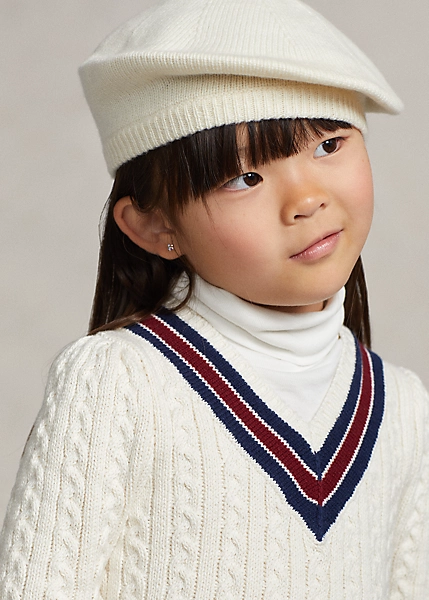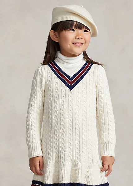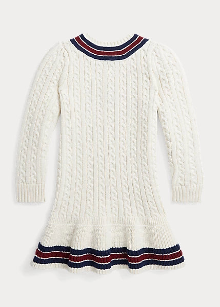 Confectionnée en coton épais à fils tournés, cette robe rend hommage au pull de cricket emblématique avec son motif torsadé, son col en V et ses bordures rayées, qui représentent traditionnellement les couleurs d’une école ou d’une équipe.