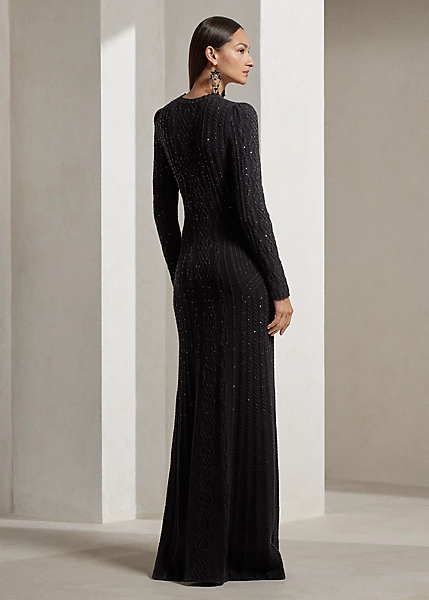 Ralph Lauren Collection revisite le pull torsadé intemporel sous forme de superbe robe de soirée à manches bouffantes. Ornée d’un motif placé d’inspiration tricot d’Aran pour une silhouette flatteuse, cette longue robe de soirée est confectionnée dans un magnifique mélange de laine et de cachemire italiens rehaussé d’étincelants ornements. Huit techniciens hautement qualifiés ont brodé à la main cette pièce d’un mélange de perles de verre et de sequins en suivant méticuleusement le motif de la robe pour plus de volume et un effet scintillant.