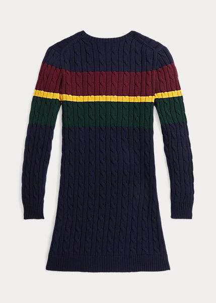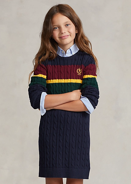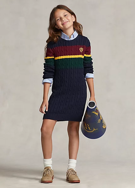 Cette robe-pull en coton affiche un style inspiré de l’école préparatoire avec son motif en tricot torsadé, ses rayures hautes en couleur et sa broderie distinctive sur la poitrine. Ralph Lauren s’associe à Better Cotton™ pour améliorer la culture du coton dans le monde. Better Cotton forme les agriculteurs pour leur apprendre à utiliser efficacement l’eau, prendre soin de l’état du sol et des habitats naturels, réduire l’utilisation des produits chimiques les plus nocifs et mettre en œuvre les principes du travail décent.