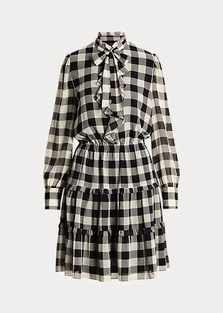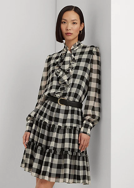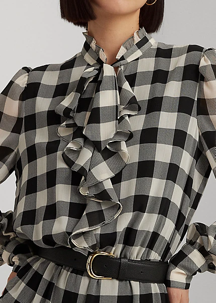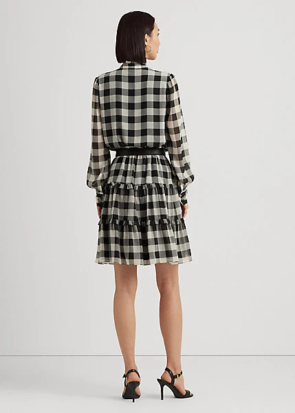 Des volants pétillants ornent la silhouette patineuse de cette robe lavallière composée d’une jupe gitane et de georgette froissée aérienne pour un mouvement naturel. Elle est revisitée pour la saison avec un motif à carreaux Buffalo intemporel.