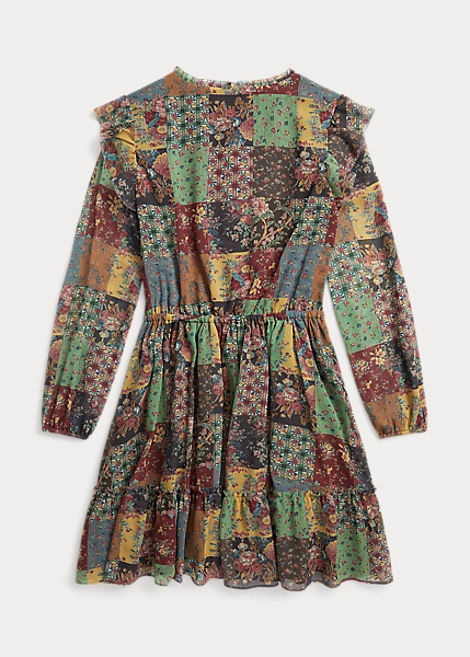 Cette jolie robe d’inspiration bohème est confectionnée en mousseline de soie aérienne, avec une bordure volantée et un motif patchwork.