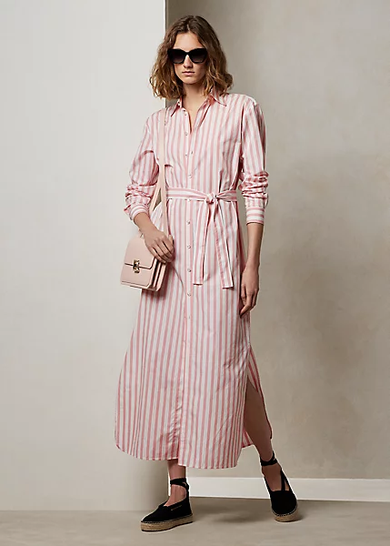Adapté d’une chemise classique, le modèle Ysabella revisite la robe-chemise distinctive de Ralph Lauren pour la saison avec une emmanchure basse discrète, des fentes latérales hautes sur la jupe pour un look de vacances et un motif rayé classique décliné dans les rose et blanc romantiques de la saison. Arborant une coupe droite légèrement décontractée, cette robe en coton arrivant aux mollets est dotée d’une ceinture assortie permettant de varier les styles.